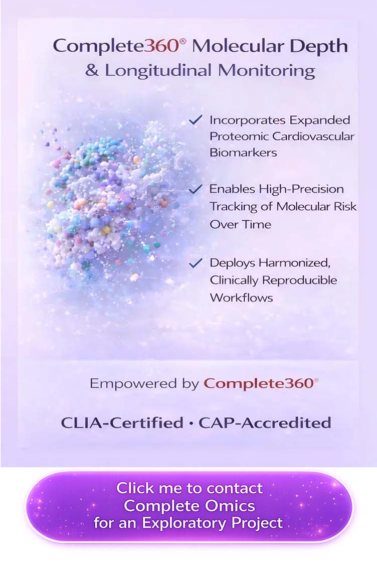 At Complete Omics, cardiovascular biomarker panels are deployed within the Complete360® infrastructure — our ultra-deep, quantitatively harmonized proteomic platform designed for clinical reproducibility.