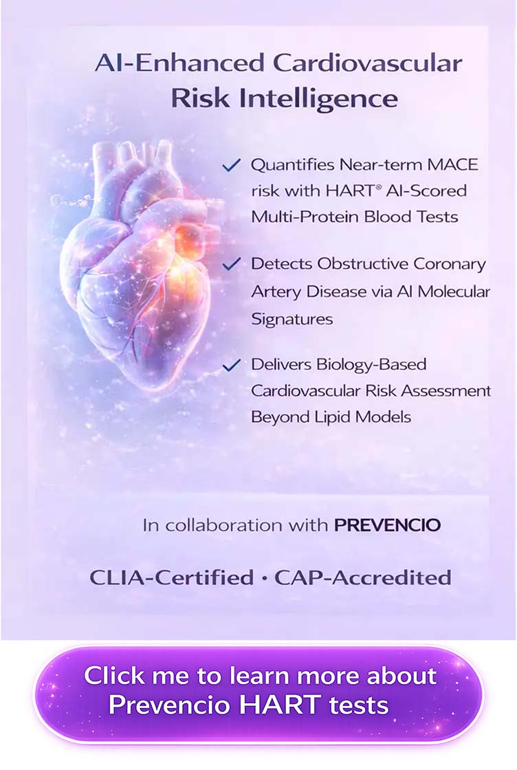 Through our collaboration with Prevencio, a pioneer in AI-driven multi-protein cardiovascular diagnostics, we provide next-generation blood-based cardiovascular risk assessment. Prevencio’s HART® platform integrates validated multi-analyte protein signatures with advanced machine-learning algorithms to: